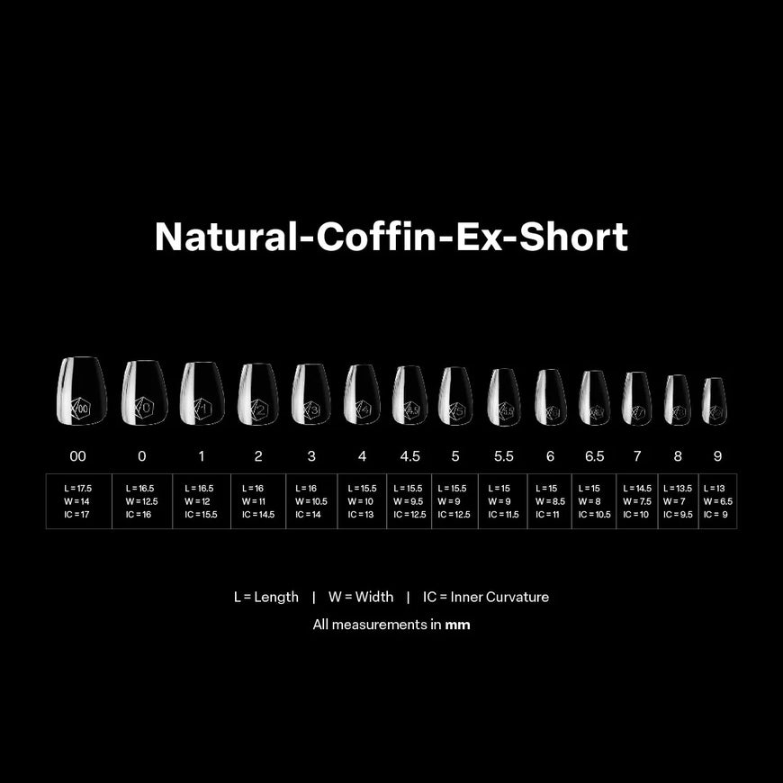 The Natural Coffin Extra Short shape offers a sophisticated coffin silhouette in a compact length, ideal for everyday wear and active lifestyles. As part of the Natural line, these tips feature a flatter surface with a subtle C curve, specifically designed for wider or flatter nail beds. This guarantees a secure, comfortable fit while enhancing the natural appearance of nails.